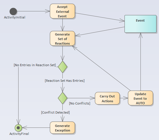 Once all decision making is done, the cycle now checks for a conflict. This is the concern above where there are transitions to more than one new state. So long as there are no conflicts, all the actions selected (no matter how many reactions are in the execution set discovered to match by the guards and state/event sets) are carried out.