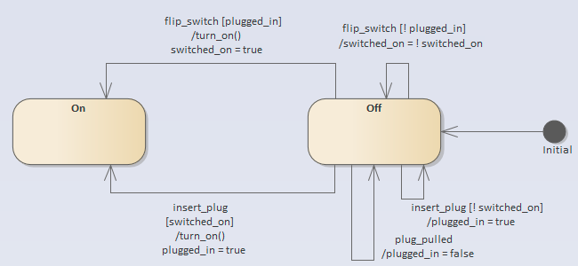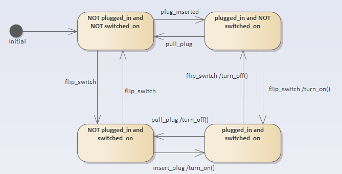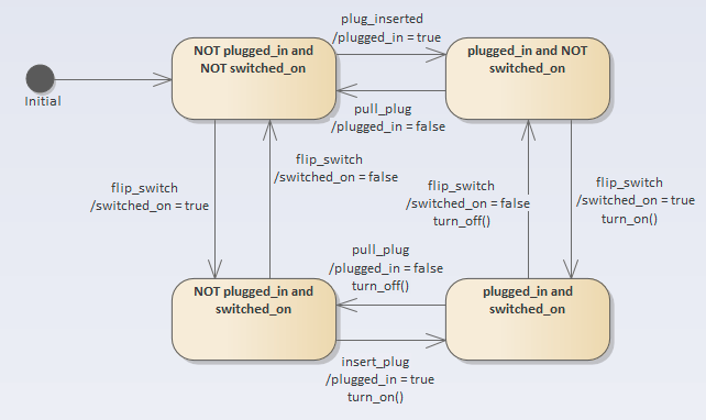 Well … that doesn’t seem so bad. However, with that diagram so far, it’s not possible to turn on the lamp. We have no way to set is_powered or plugged_in when the other isn’t already set. So, more transitions are needed …