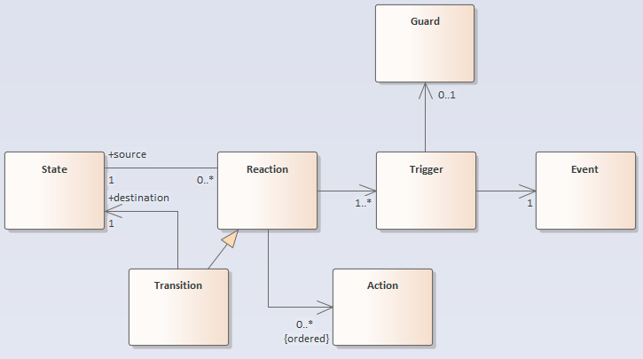 Reactions and triggers aren’t part of the normal state machine lexicon. Generally, machines have transitions with optional actions.